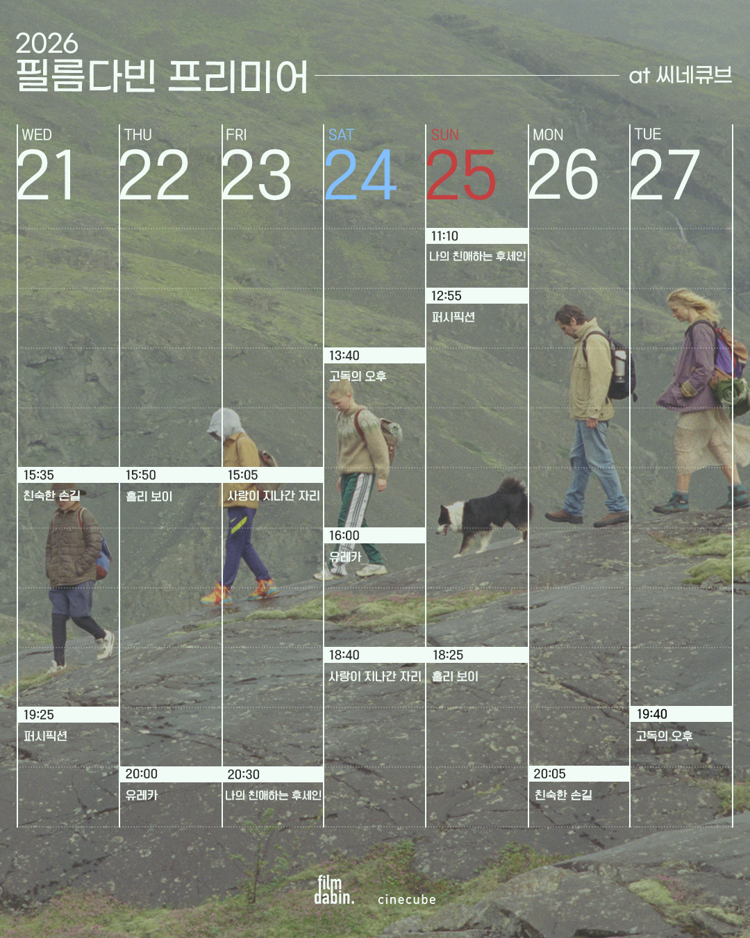 '2026 필름다빈 프리미어 at 씨네큐브'의 상영시간표를 공개합니다.
